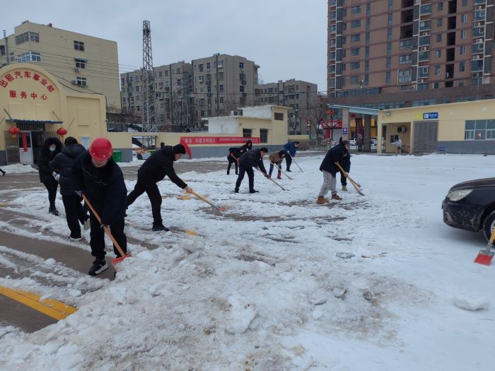 大家迎著寒風(fēng),分工合作,有拿著的鐵鍬奮力鏟雪,有的推著大鏟子將鏟好的冰雪推至墻邊,有的撒著融雪劑,大家齊心協(xié)力,不畏嚴寒、干勁十足、分工有序,整個場面熱火朝天。經(jīng)過干部職工齊心協(xié)力、團結(jié)合作事業(yè)部院內(nèi)冰雪得到有效清理。