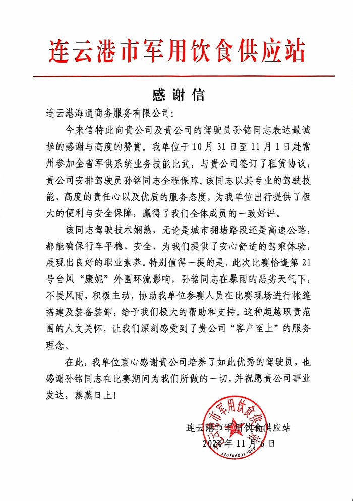 近日,汽服公司權屬汽車租賃事業(yè)部收到了一封來自連云港市軍用飲食供應站的感謝信,信中表達了對租賃事業(yè)部政務保障車駕駛員孫銘的感謝與肯定。紙短情長,一封感謝信承載了客戶對駕駛員的信任與感激,也傳遞了汽服公司“客戶至上”的服務理念。