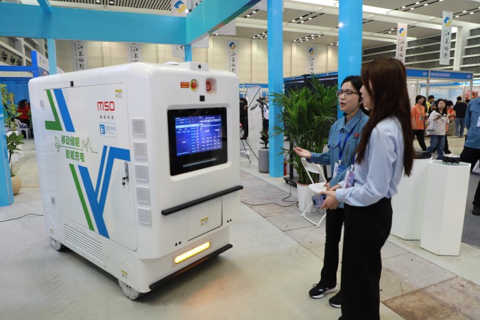 現(xiàn)場的海宏科技充電移動機(jī)器人移動演示吸引了眾多參觀者駐足觀看并打卡拍照。其高效便捷的充電方式和智能化的操作流程,展示了公司在智能充電領(lǐng)域的創(chuàng)新實(shí)力和對綠色出行未來的積極探索,成為展會的一大亮點(diǎn)。MSO移動充電機(jī)器人搭載了全球同類設(shè)備中最大容量的209kWh磷酸鐵鋰儲能電芯,采用120kW液冷快充,在同類產(chǎn)品中處于領(lǐng)先位置,同時移動充電機(jī)器人輸出電壓支持1000v的高壓平臺。在硬件上,是全球唯一一家采用伺服驅(qū)動麥克納姆輪方案,可以實(shí)現(xiàn)360°全方位旋轉(zhuǎn)以及平移、側(cè)移,對通過狹小空間極具優(yōu)勢,滿足不同場景需求,極大簡化自動駕駛邏輯。車身搭載激光雷達(dá)、超聲波避障以及360°環(huán)視;基于硬件,可實(shí)現(xiàn)低速自動駕駛與5G云駕駛,同時融合了分布式儲能、快速充電樁與移動機(jī)器人的產(chǎn)品屬性,顛覆傳統(tǒng)車找樁模式,開啟新能源時代樁找車的全新生活方式。