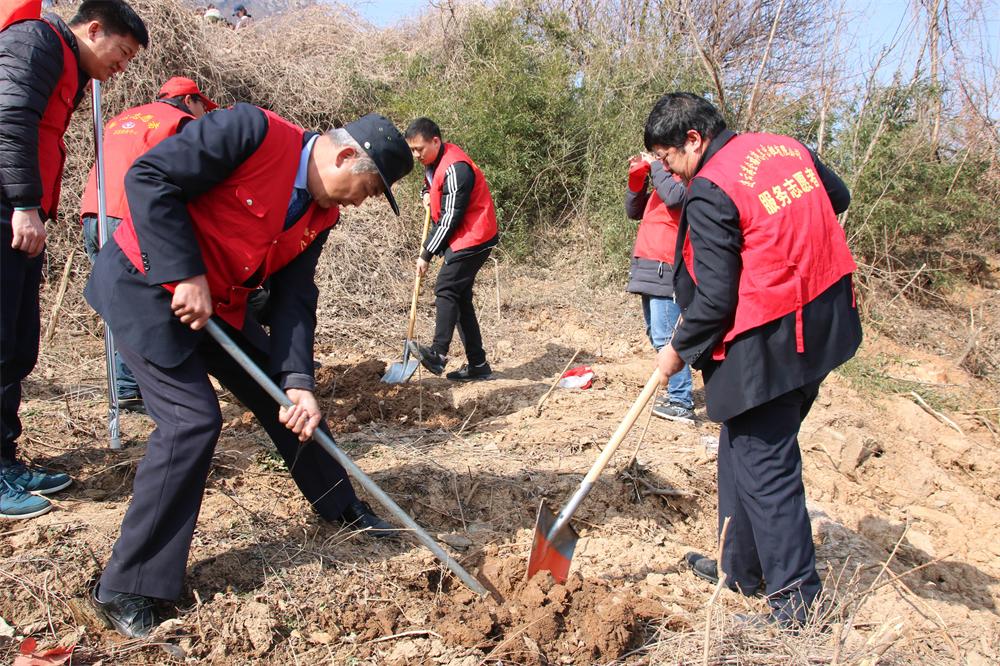 植樹現(xiàn)場,大家領(lǐng)取了鐵鏟、小樹苗、水桶,從9點起“黨員的士”志愿者們興致勃勃的開始植樹,大家不怕苦和累,挖坑、植苗、培土、澆水,一氣呵成,一直持續(xù)到11時10分,的哥的姐們表示寧愿少開一天車,多種一棵樹,為改善生態(tài)環(huán)境,美化港城的青山綠水,獻(xiàn)上自己的愛心。